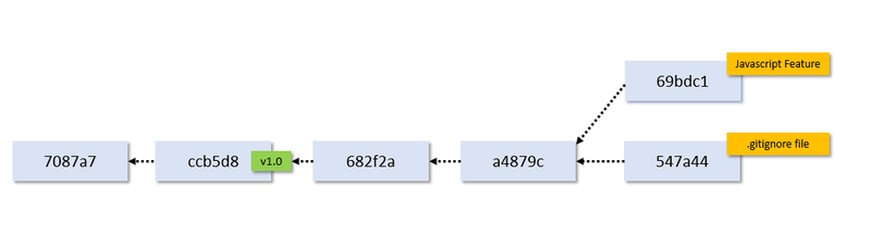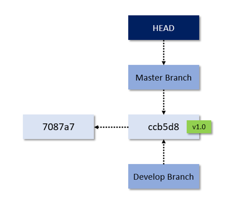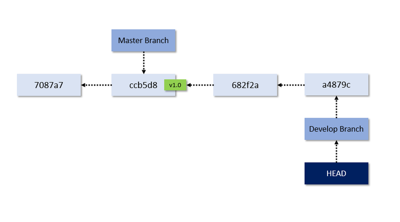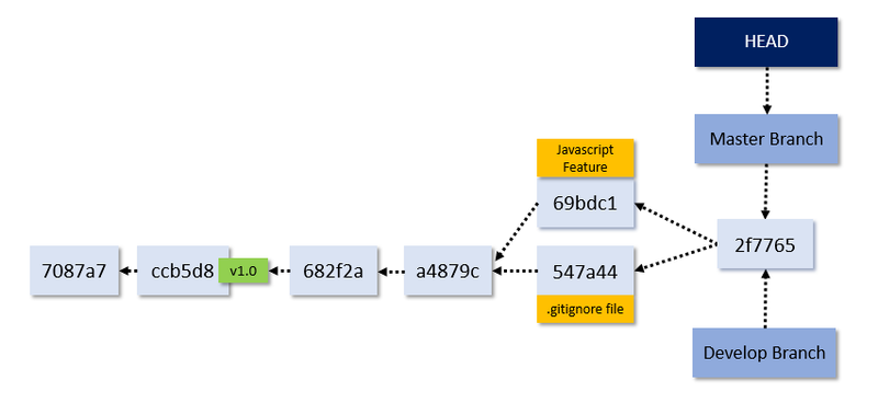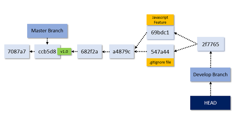Notice how in the second version of the command, we see (HEAD -> master, tag: v1.0, origin/master, develop). What does all this mean? To answer that question, we need to understand what branches are and how they work. Currently, our Git repository looks like this: