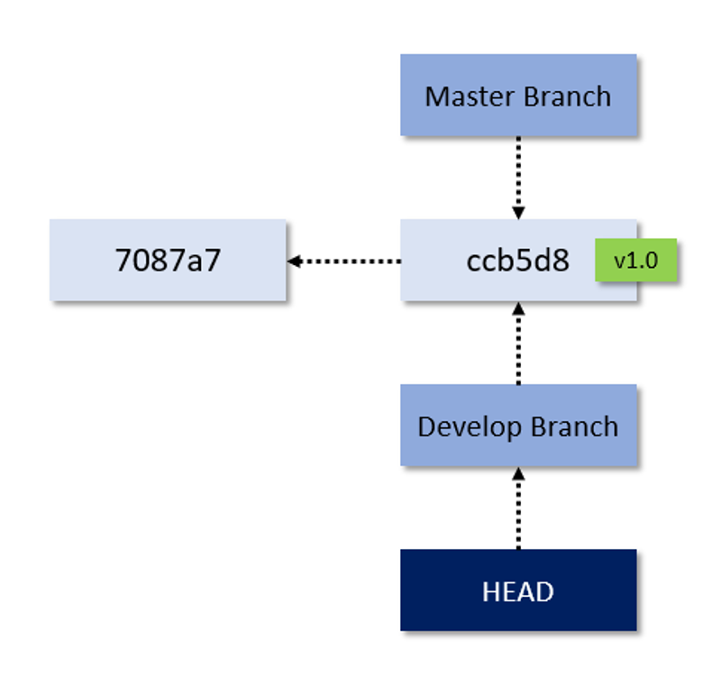 Understanding what the HEAD pointer does is paramount to understanding Git. The HEAD pointer will always be pointing at something, and whatever it is pointing at is the snapshot that you are currently working in. In this case, we see that HEAD is pointing at master which is pointing at the most recent commit. Yes, we created the develop branch just a moment ago, but HEAD is still pointing at master, which means that any changes that we stage and commit will be on the master branch. Let's switch to the develop branch because we do not want to make changes to our "production" release v1.0.
