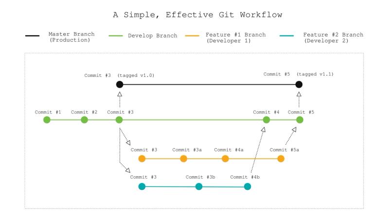 If you are working on a larger project with a complex codebase, this method will provide you with a general understanding of how to contribute, but will not be entirely sufficient. Some repositories will utilize 5+ different branches to develop software including branches for features, hotfixes, a main development branch, release branches, and even Git submodules within the project. We do not have the time or reason to get that complex, and therefore the method I will show you includes a workflow with only 3 branches. You can see it below, but I suggest opening it and printing it out for reference.