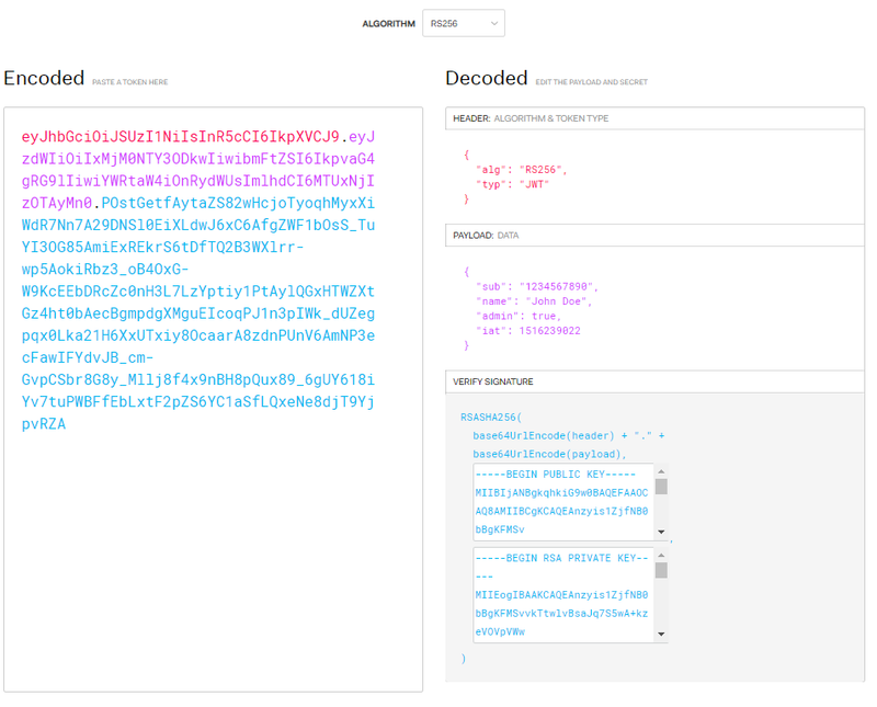 You'll notice that a JWT has 3 parts (separated by periods). The first part is the header, the second part is the payload, and the third part is the digital signature. If you pasted the above JWT into this tool and select the RS256 algorithm, you would get the following data back: